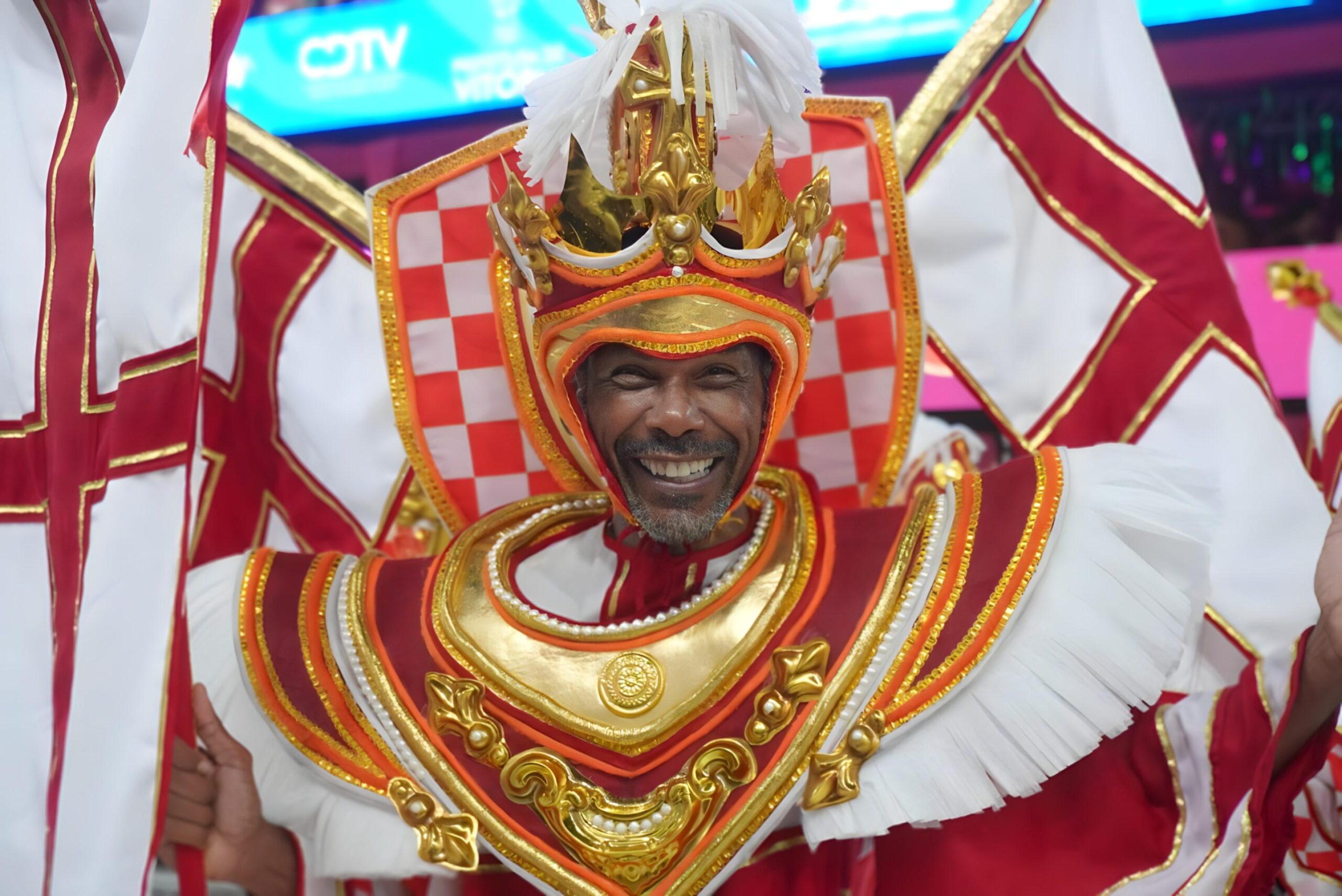 Fogos de artifício, um breve apagão e papel picado anunciaram a vinda de São Jorge a avenida do Sambão do Povo, em Vitória.