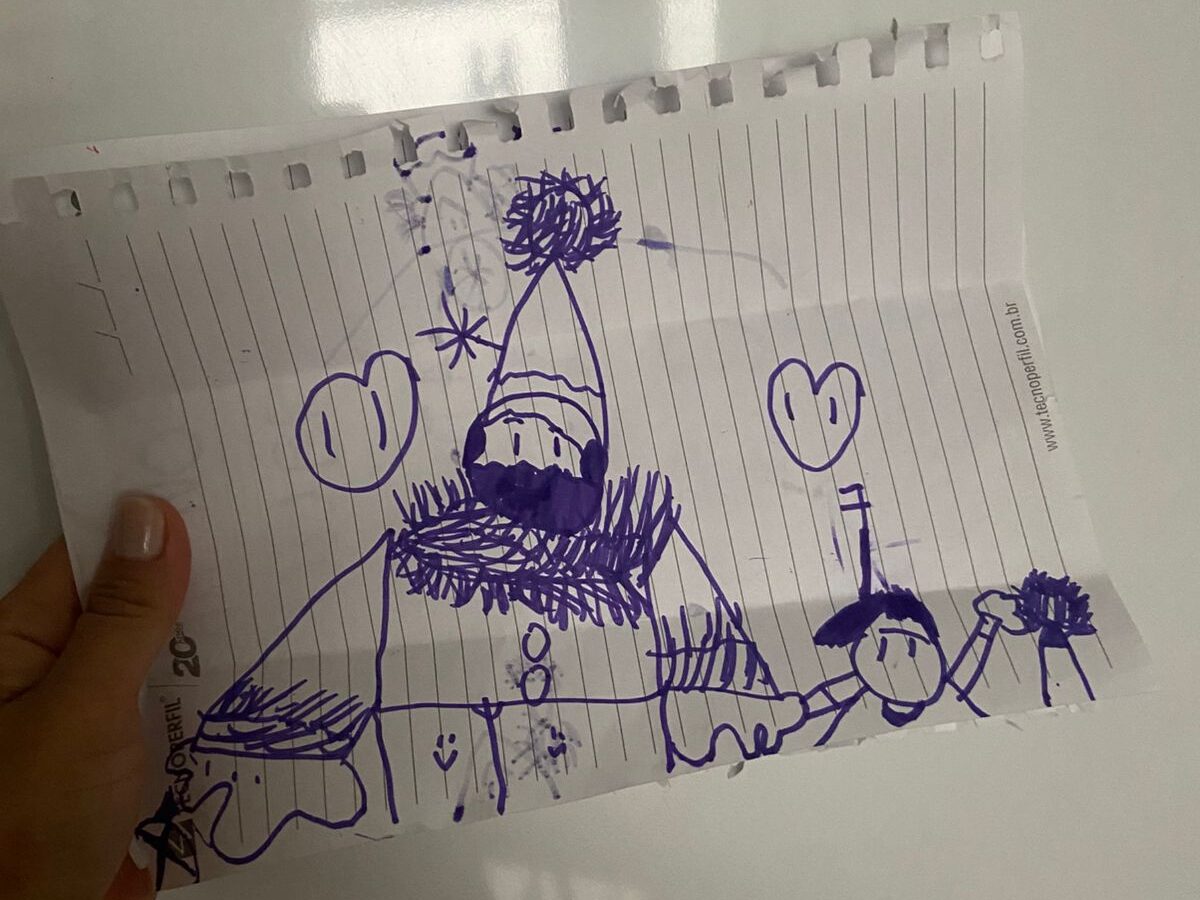 Francisco fez a carta pedindo presentes, mas disse que não fazia sentido pregar na árvore de Natal porque Papai Noel não existe. Vale ressaltar que ele respeita as tradições, e, portanto, desenhou a si mesmo de mãos dadas com o velho.